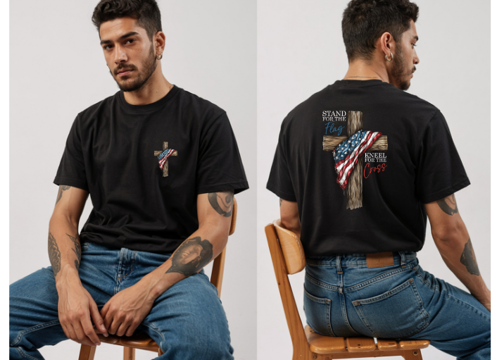 This Gildan Softstyle t-shirt features a bold design expressing pride in standing for the flag and kneeling for the cross. Made from soft, breathable cotton, it offers superior comfort and durability. Perfect for those who want to showcase their respect and faith with a stylish, high-quality tee.
